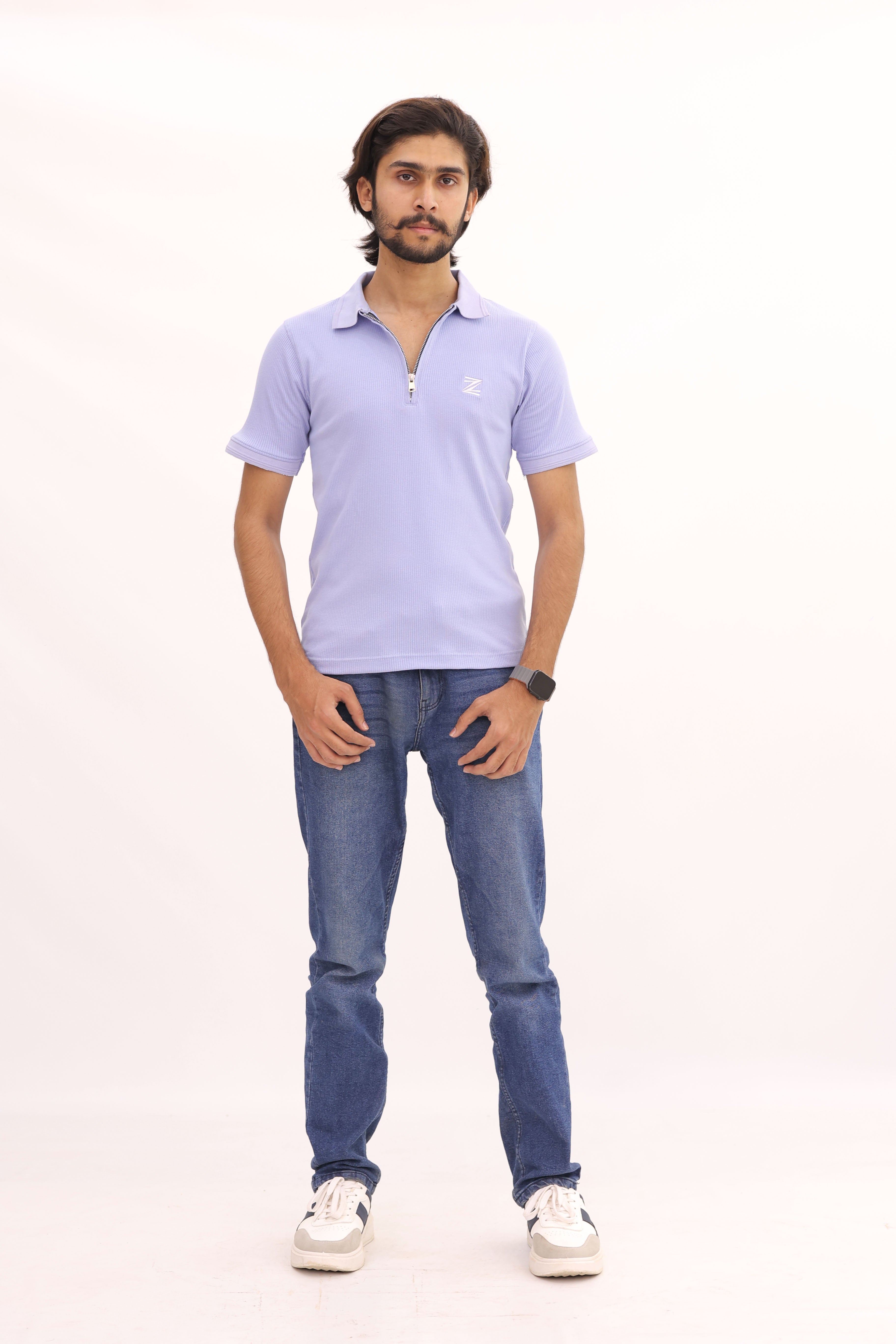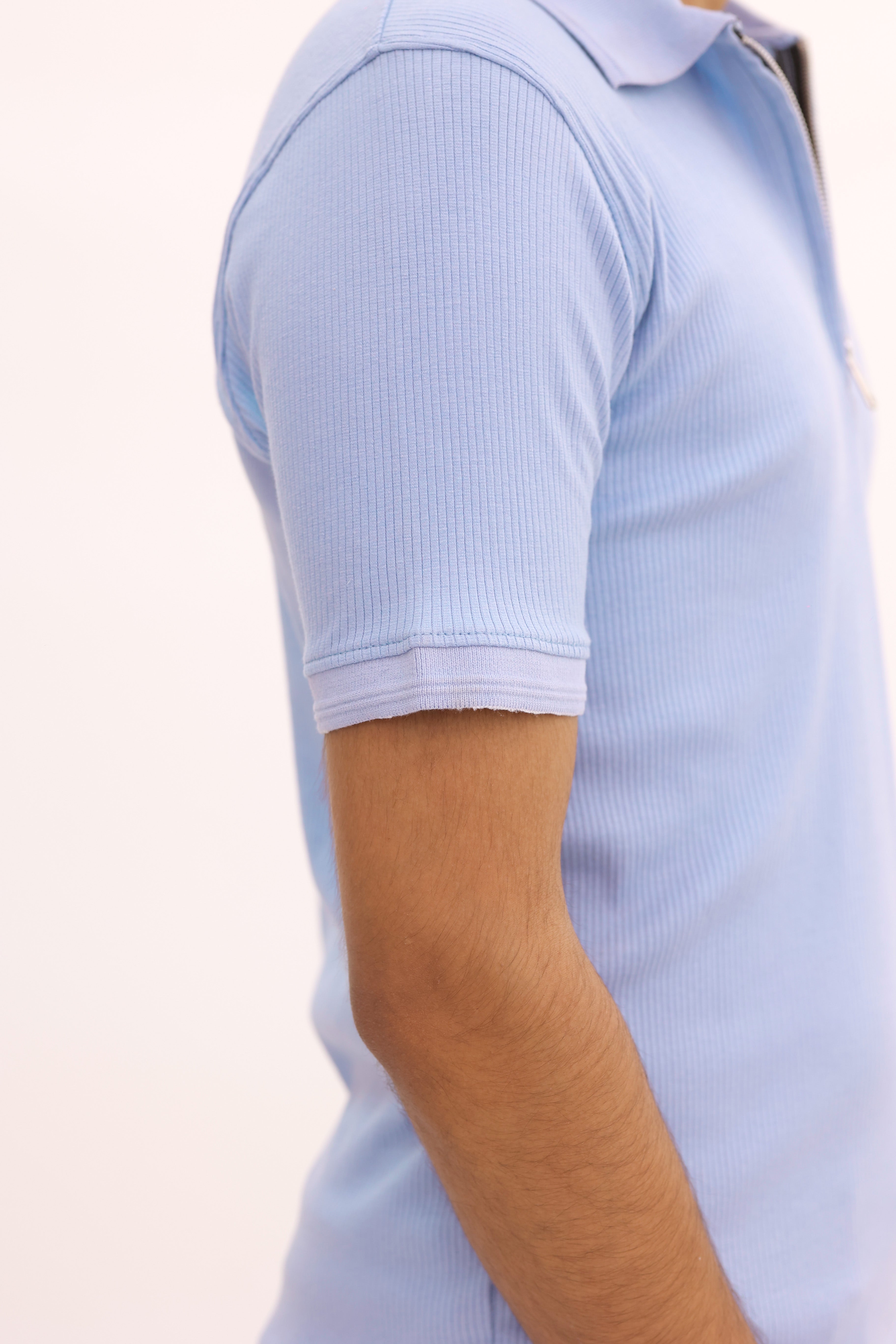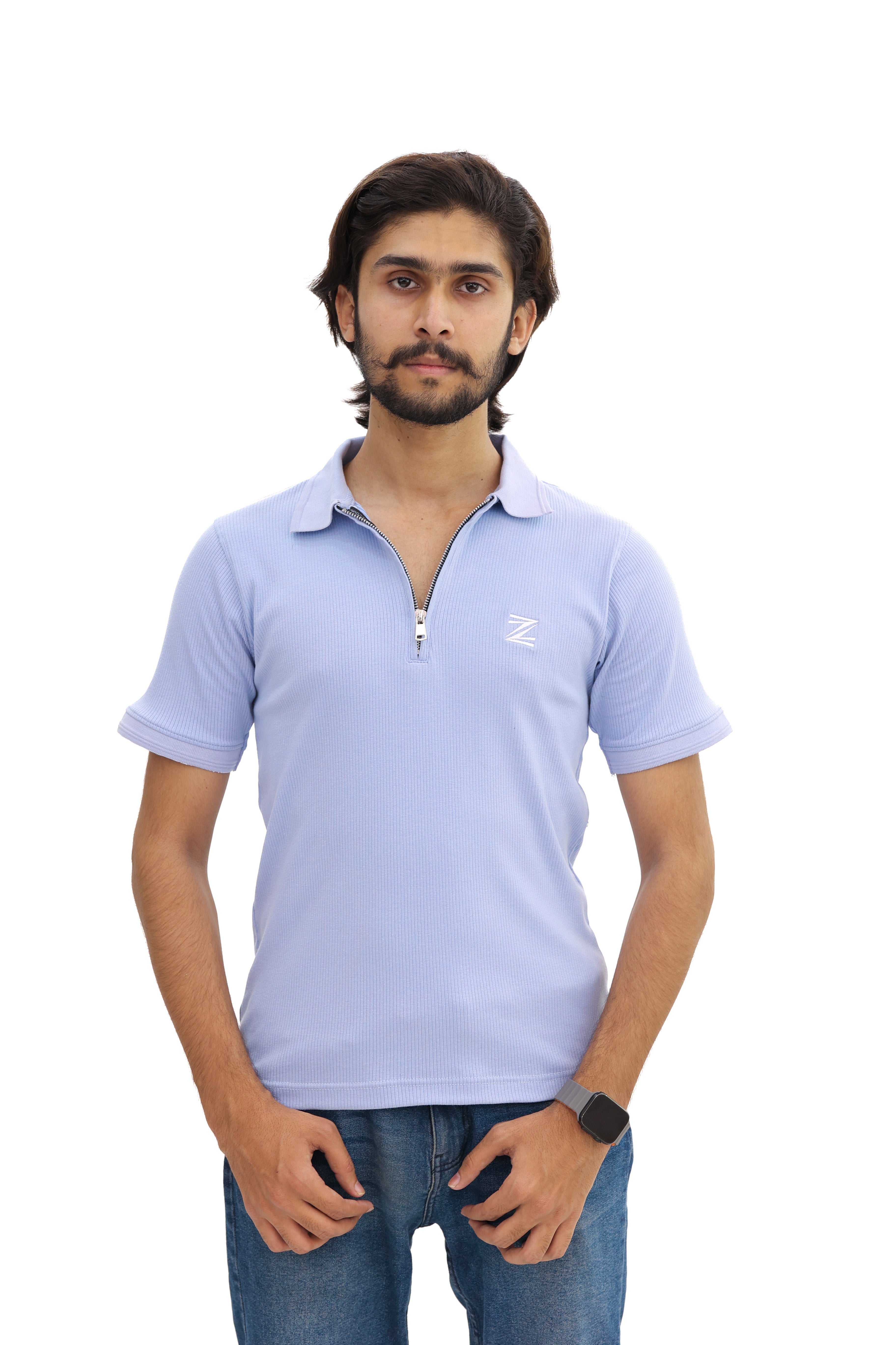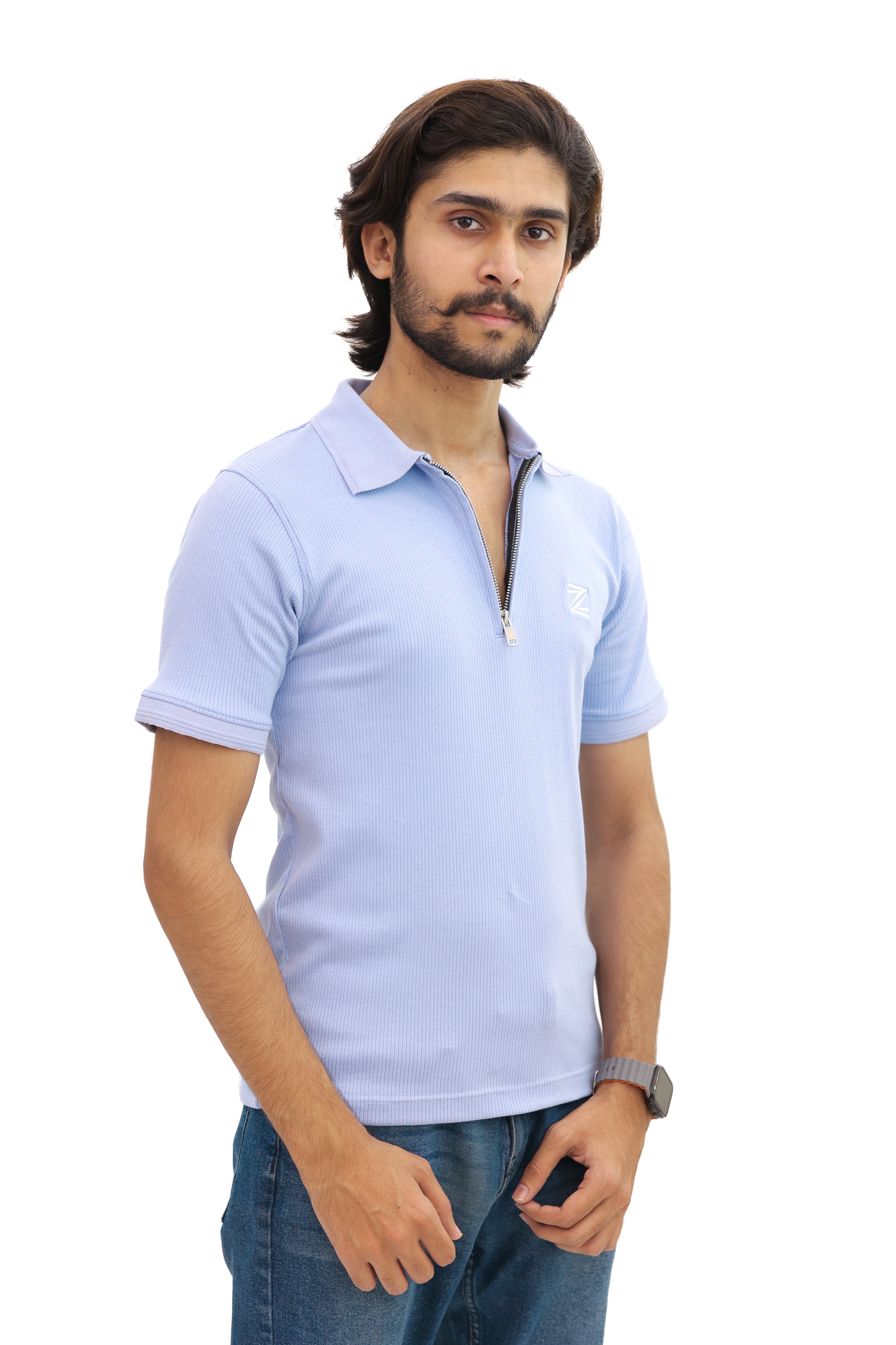 This Export Quality Knitted Drop Needle Zipper Polo features a stylish half sleeve design and a refreshing sky blue color. Perfect for any occasion, this polo provides both comfort and style. Upgrade your wardrobe with this expertly crafted piece. Description