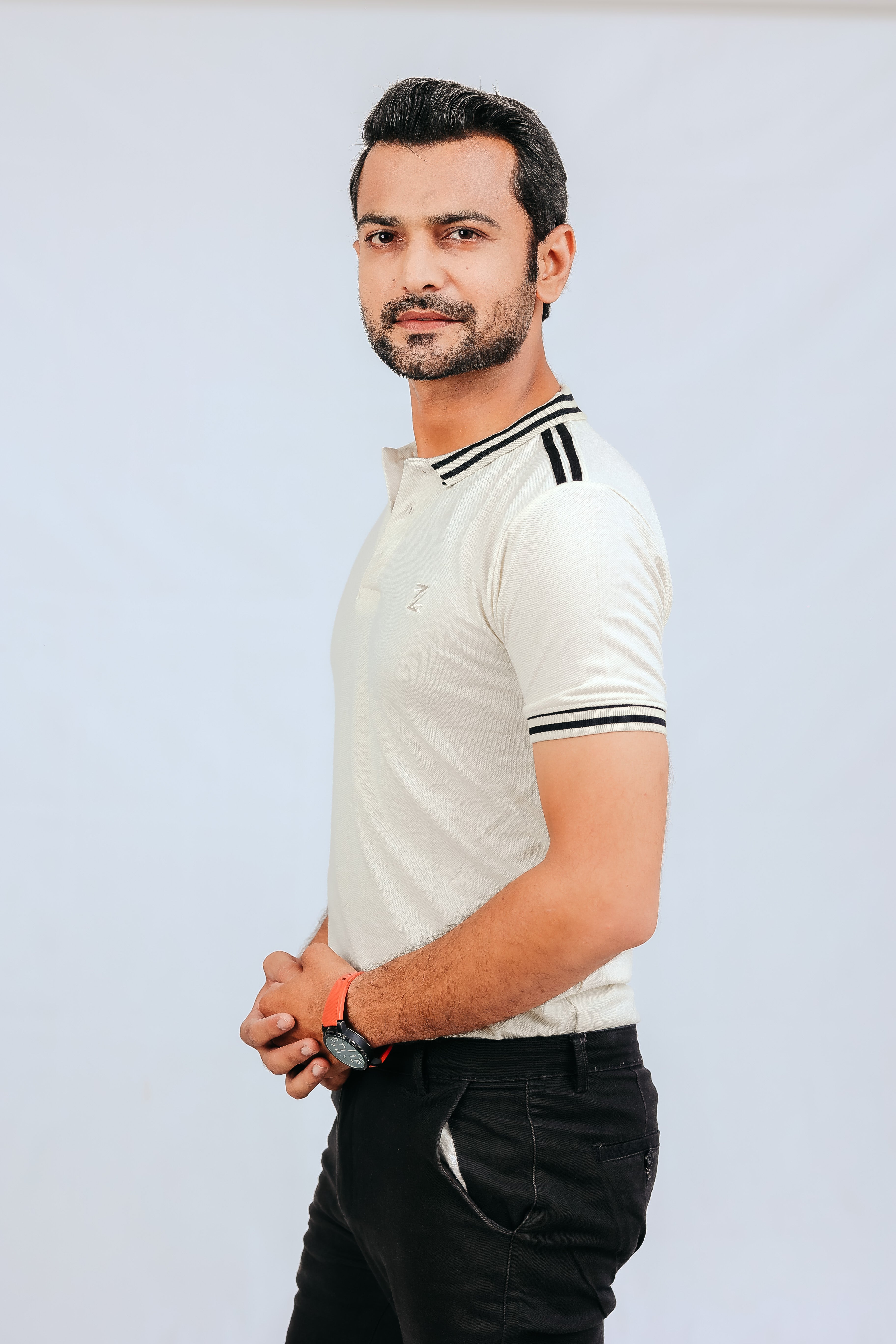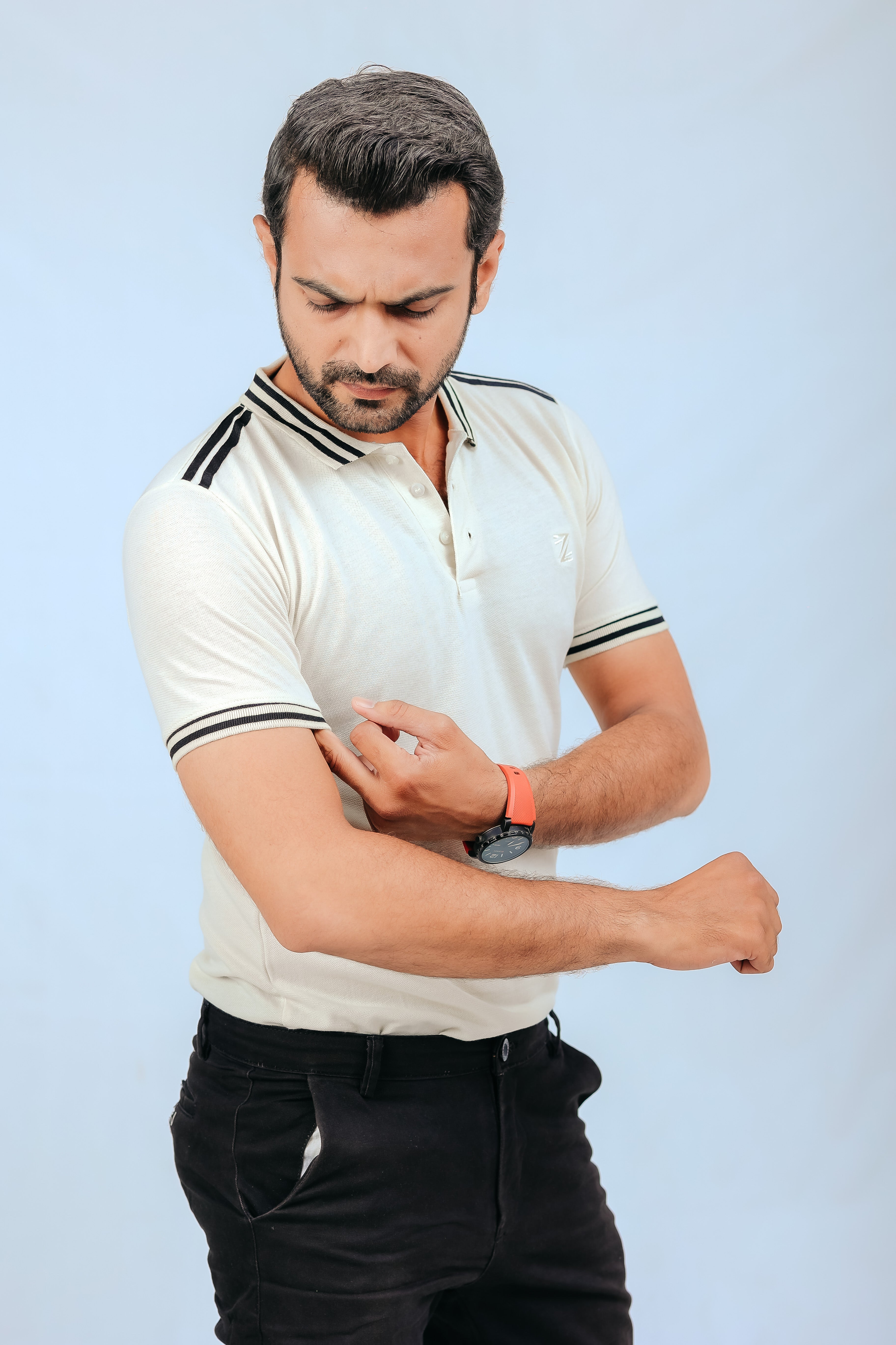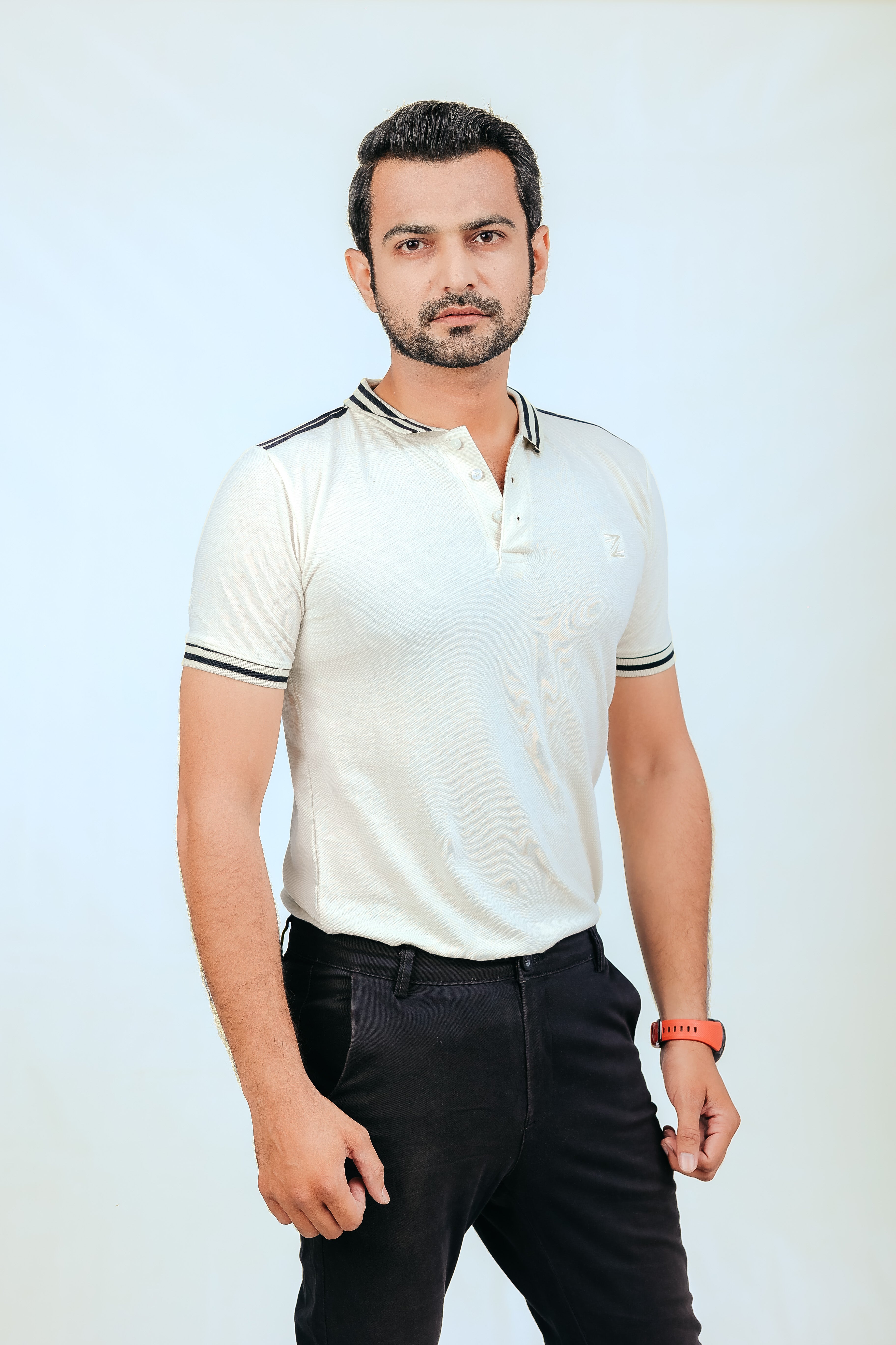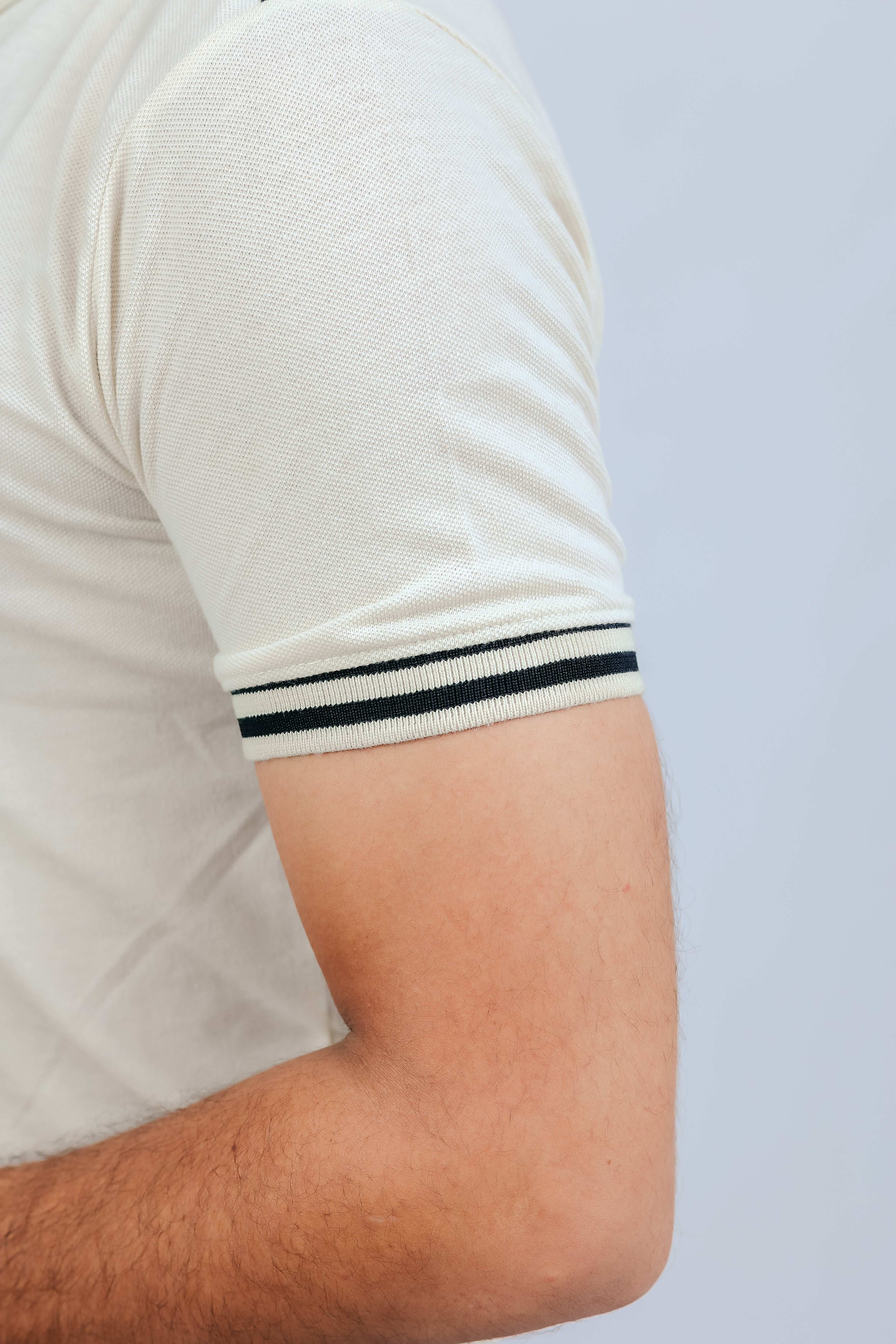 Classic off-white polo with double-lined shoulder and cuff stripes, made from premium export-quality fabric. Available in Small, Medium, and Large sizes for a polished, casual style!